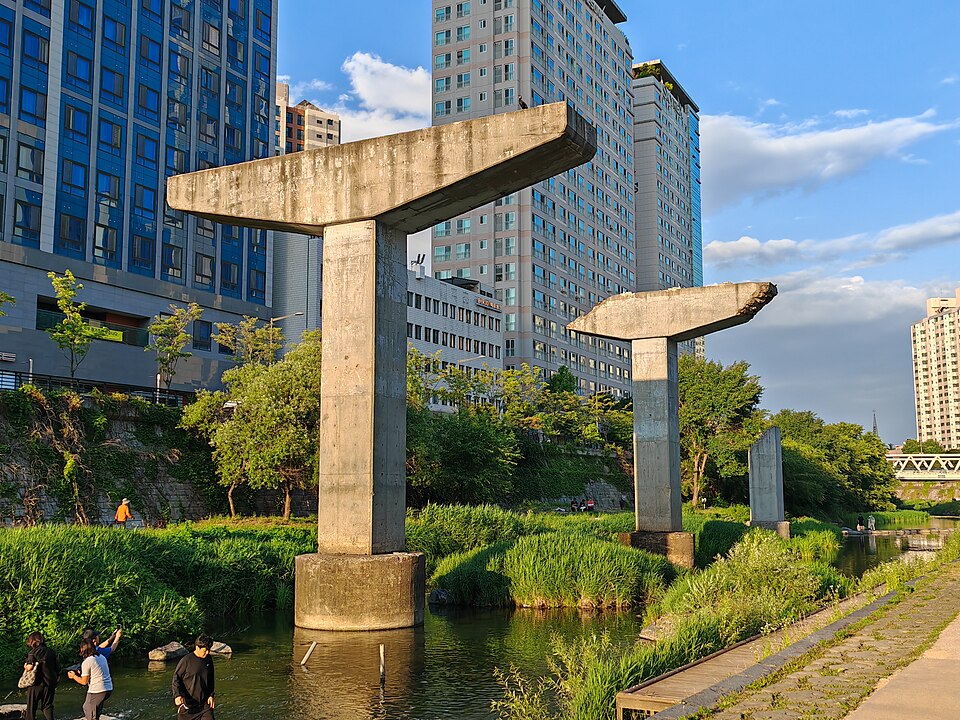When Cheonggeyechon River is low, pedestrians can enjoy walking through the flood infrastructure in-between busier main streets.Photos by Ken Eckert and Dwxn.
