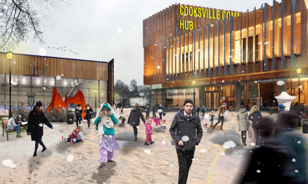 Green infrastructure and cultural amenities can come together to create a vibrant community in Cooksville.Rendering by Infrastructure Institute (2025).