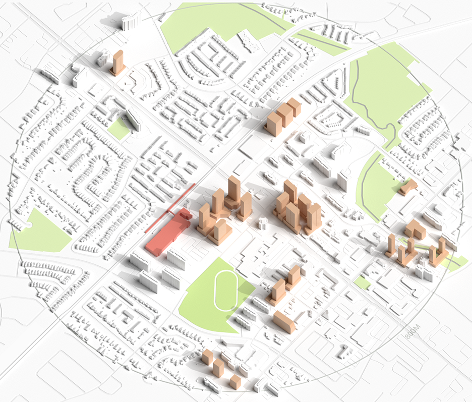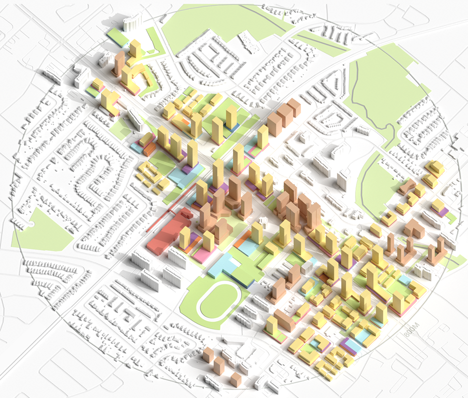 At the neighbourhood level, Canadian cities have long been leaders in setting guidelines for what services should be available nearby, from schools to transit stops to grocery stores. [11] Our optimized plan for Cooksville Station builds on this, integrating community theatres, youth centres, and libraries directly into new mixed-use blocks.