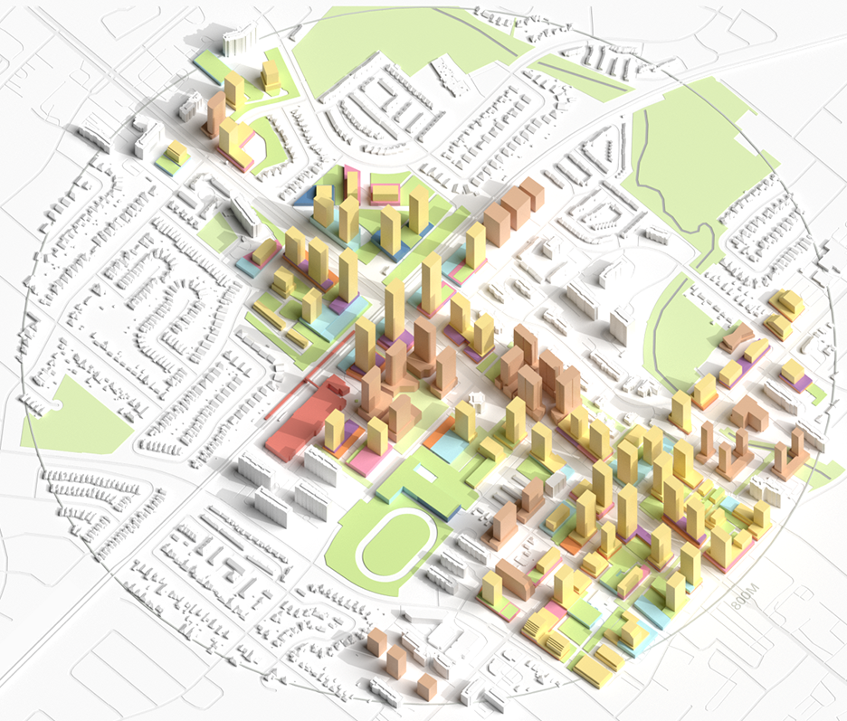 Development currently proposed or under construction within 800 metres of Cooksville Station.Rendering by Infrastructure Institute (2025).