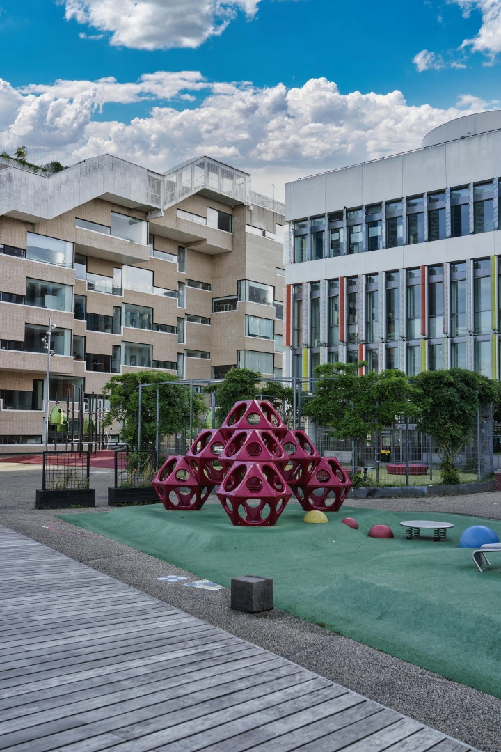 Safety and connection are also essential, with many studies citing windows and balconies as areas that can be improved with required safety mechanisms to make units more family-friendly. [8] Within buildings, ensuring that there are shared spaces, courtyards with play areas, and facilities that children can access – including elevator buttons at child level – encourages connection and independence.