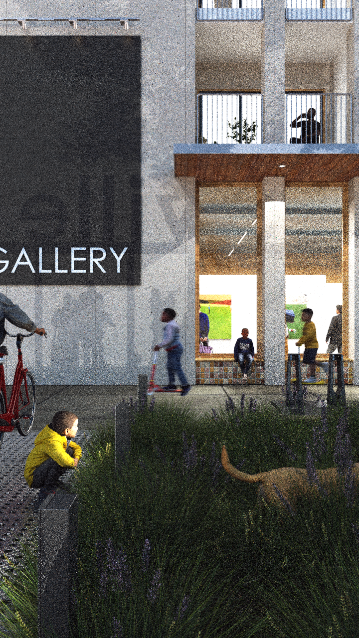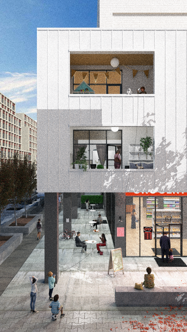 Mixed use public space, designed for all ages.Rendering by Infrastructure Institute (2025).