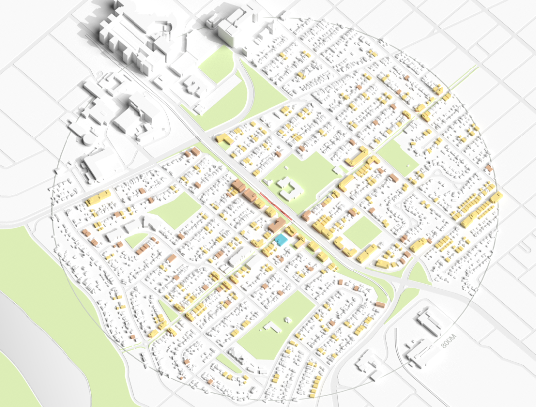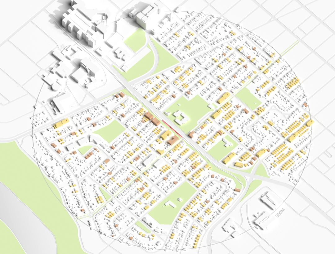 Here we explore an alternative scenario that optimizes for what are often called the “3Ds” of transit-oriented development – density, a diverse mix of land uses, and high-quality design – by encouraging mixed-use developments that can bring vitality to the area by co-locating housing with retail, community centres, and public services near transportation. [4] A central piece, therefore, is the creation of a destination-focused station area. Locating development where transit access is strongest allows density to function as a catalyst for amenities, activity, and daily destinations.