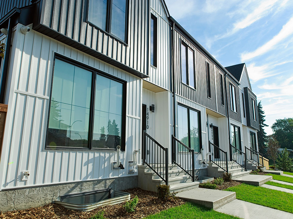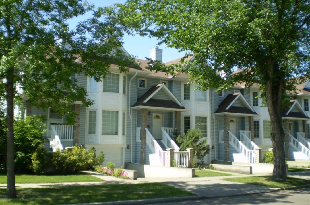 Medium-density rowhouses on large corner lots, like those pictured here, can help to increase density around transit and support amenities and infrastructure.Photo by the City of Edmonton, 2024.