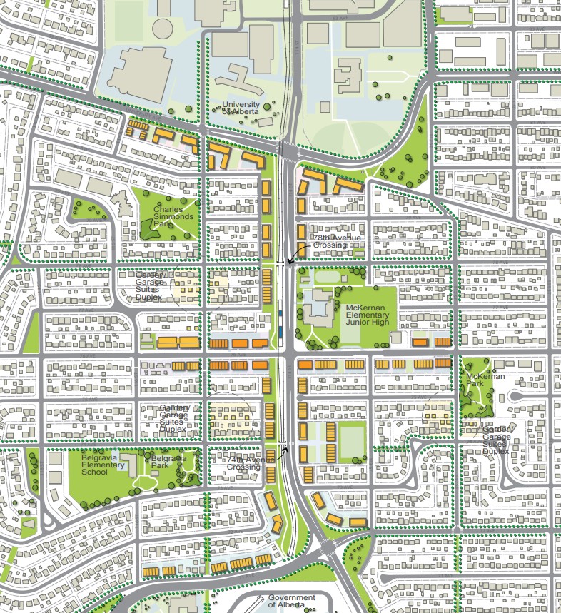 Going forward there is an opportunity to create a vibrant, walkable hub around the transit station that integrates shops and community infrastructure like libraries and community centres into larger buildings with housing above. The City’s vision calls for strategic density: medium-scale, mixed-use buildings – generally mid-rise forms with active ground floors – along major arterials like 114 Street and 76 Avenue, complemented by new amenities and multimodal routes, with more modest infill within the neighbourhood fabric. Achieving this vision will mean encouraging a mix of higher-density construction close to the transit station alongside the small-scale infill that is emerging.