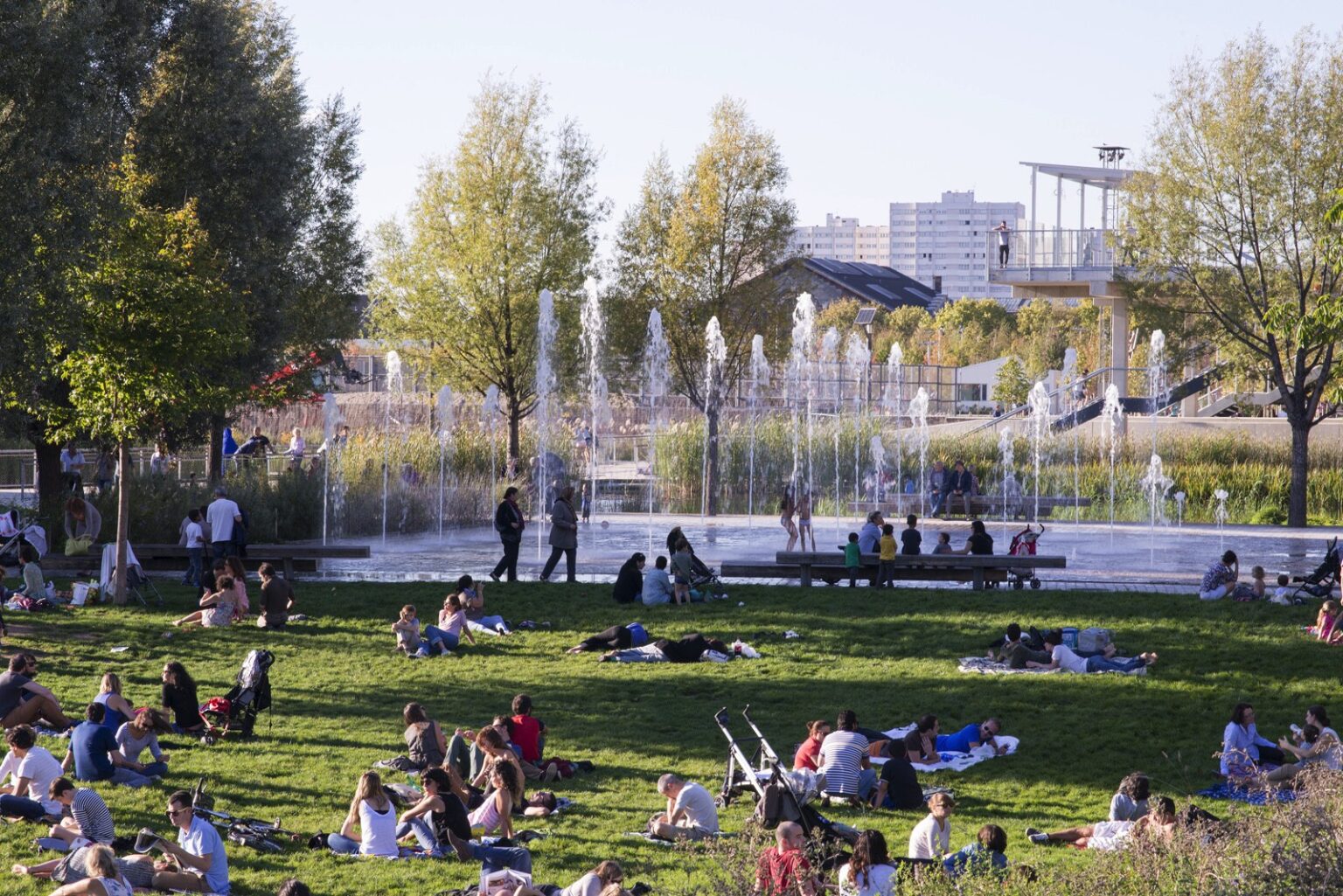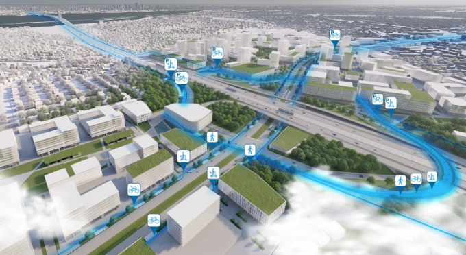 Among the core features of the plan are wide esplanades and public spaces that feature fountains and public art; pedestrian walkways connecting larger roads and making the large parcels more walkable; and designated space for sports and cultural amenities. A large central park takes inspiration from Clichy-Batignolles-Martin Luther King Park in Paris, and green space targets for individual sites scale up with greater intensity of development. A boucle active (active loop) will reunite the quadrants of the neighbourhood with cycling and pedestrian paths that weave over and under the highways. [3]
