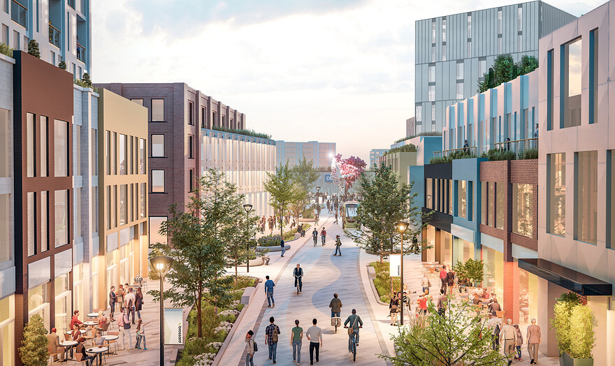 In late 2025, the City approved the first development in the area, a 30-storey residential development with office, co-working, and local retail spaces on the ground floor. [6] Nearly a third of the site is dedicated to public space, with 17% allocated as green space. [7]