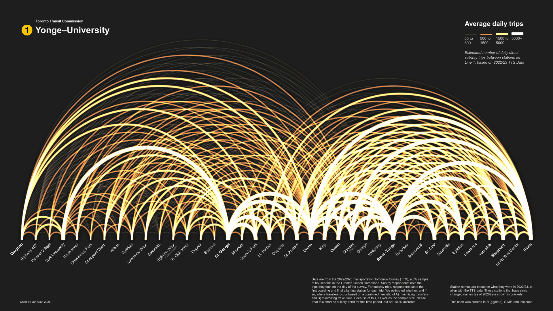 Specifically, data for this arc diagram are from the Transportation Tomorrow Survey (TTS). Survey respondents note the trips they took on the day of the survey. For subway trips, respondents state the first boarding and final alighting station for each trip. The TTS is approximately a 5% sample of households, so while not comprehensive, it does provide a good overview of travel patterns. The survey was conducted in two parts, one in Fall 2022 and another in Spring 2023, which were both used in this diagram.