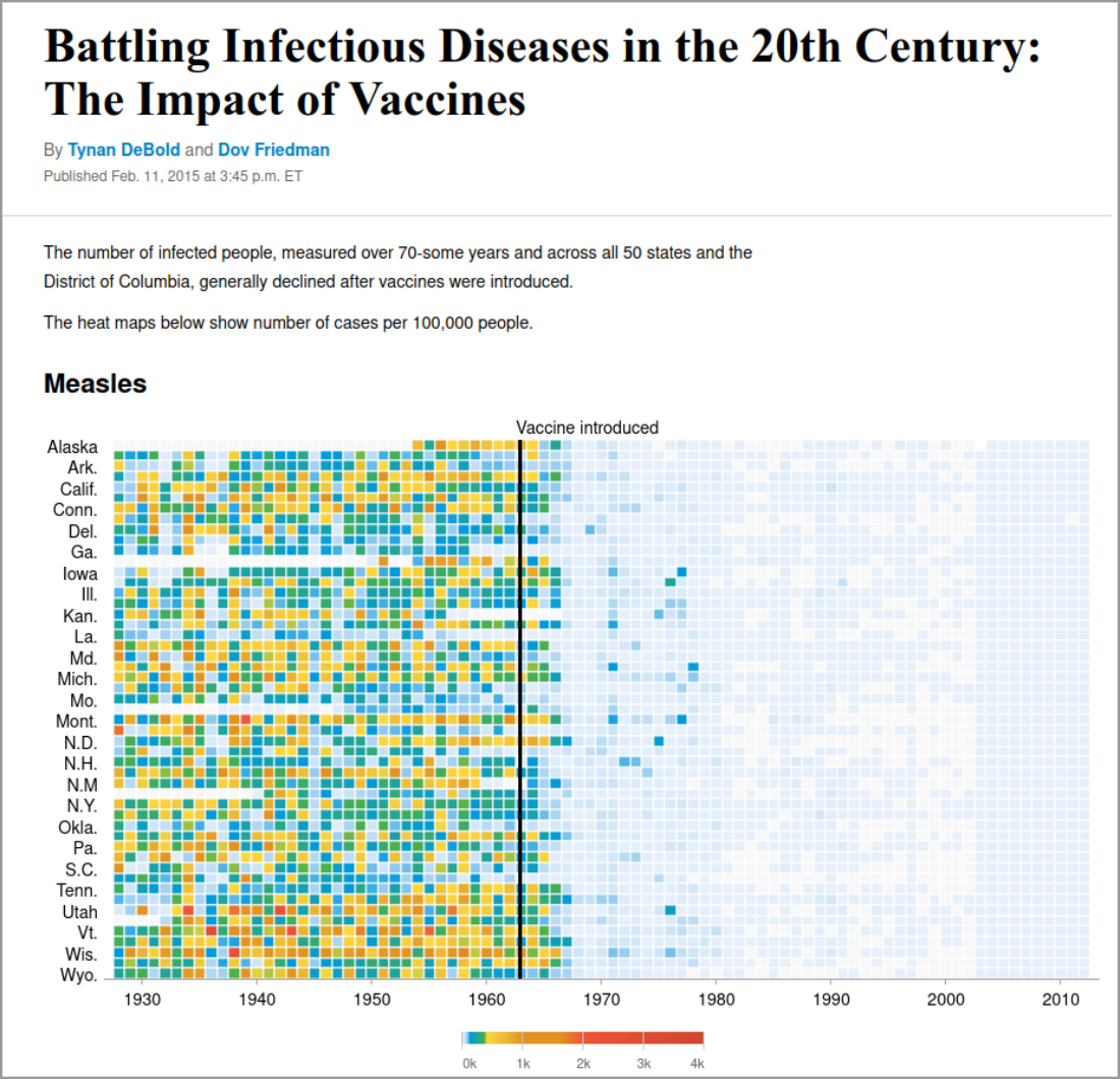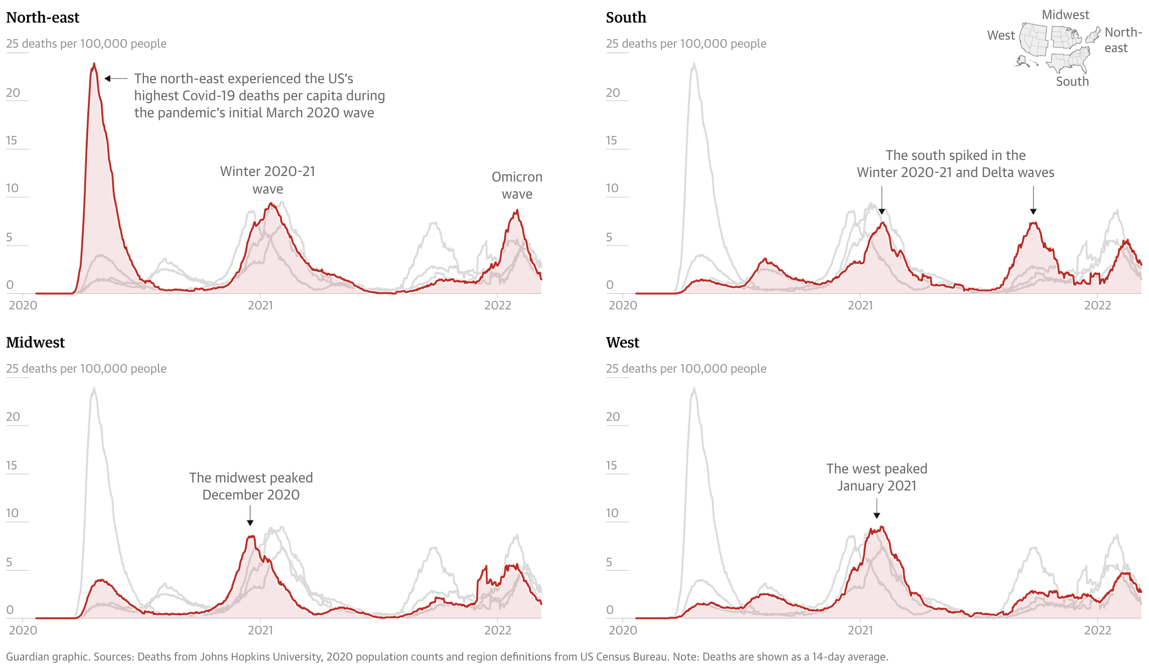 Here’s an example of a visualization of COVID-19 deaths from The Guardian that has limited visual clutter and strong hierarchy.