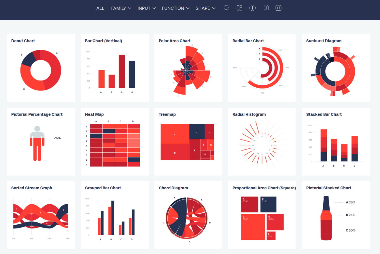 For a deeper dive into chart selection, visit From Data to Viz, a comprehensive, visual guide that helps you choose the most appropriate chart based on your data structure and communication goals. The Financial Times also has a “visual vocabulary” guide for which approach to take to visualizing data. For a wider range of charts, including types of infographics, check out Data Viz Project