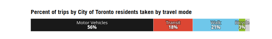 For example, we plotted out travel mode share in Toronto, but instead of having categories for different types of public transit (bus, subway, regional rail), we combined all into one category since the story was focusing on all transit, not sub-types.