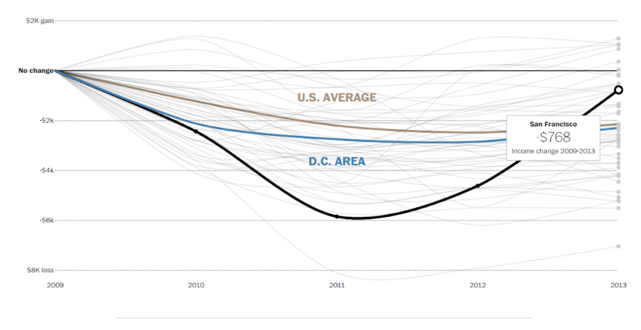 For example, in the line chart below, we started with a mass of grey spaghetti representing all the large metropolitan areas in the US, with the idea of highlighting the post-recession dip in income in San Francisco, as compared to the US average. We then decided to highlight the Washington D.C. area as another point of comparison. But we labeled the San Francisco story in order to keep the reader’s attention focused on it.